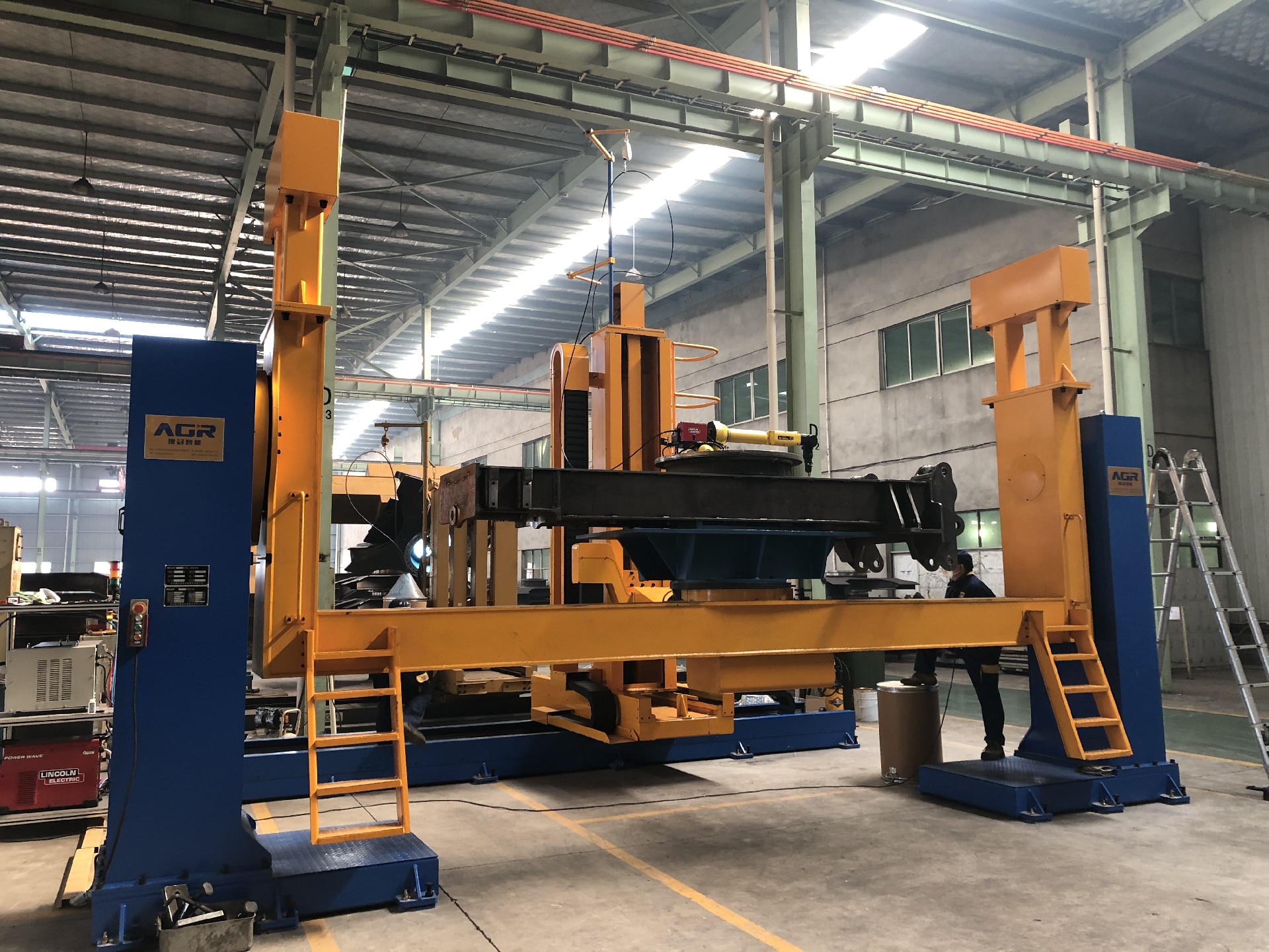 2. 兩軸H型變位機:變位機能夠在工件周圍進行連續(xù)轉(zhuǎn)動,使得機器人能夠從不同角度接近工件,實現(xiàn)連續(xù)焊接。這種設(shè)計提高了焊接過程的連續(xù)性和一致性,從而提高了焊接質(zhì)量。H型變位機最大負載達到5000kg,適用于大型結(jié)構(gòu)件的焊接,確保了重型工件的穩(wěn)定性和焊接精度。