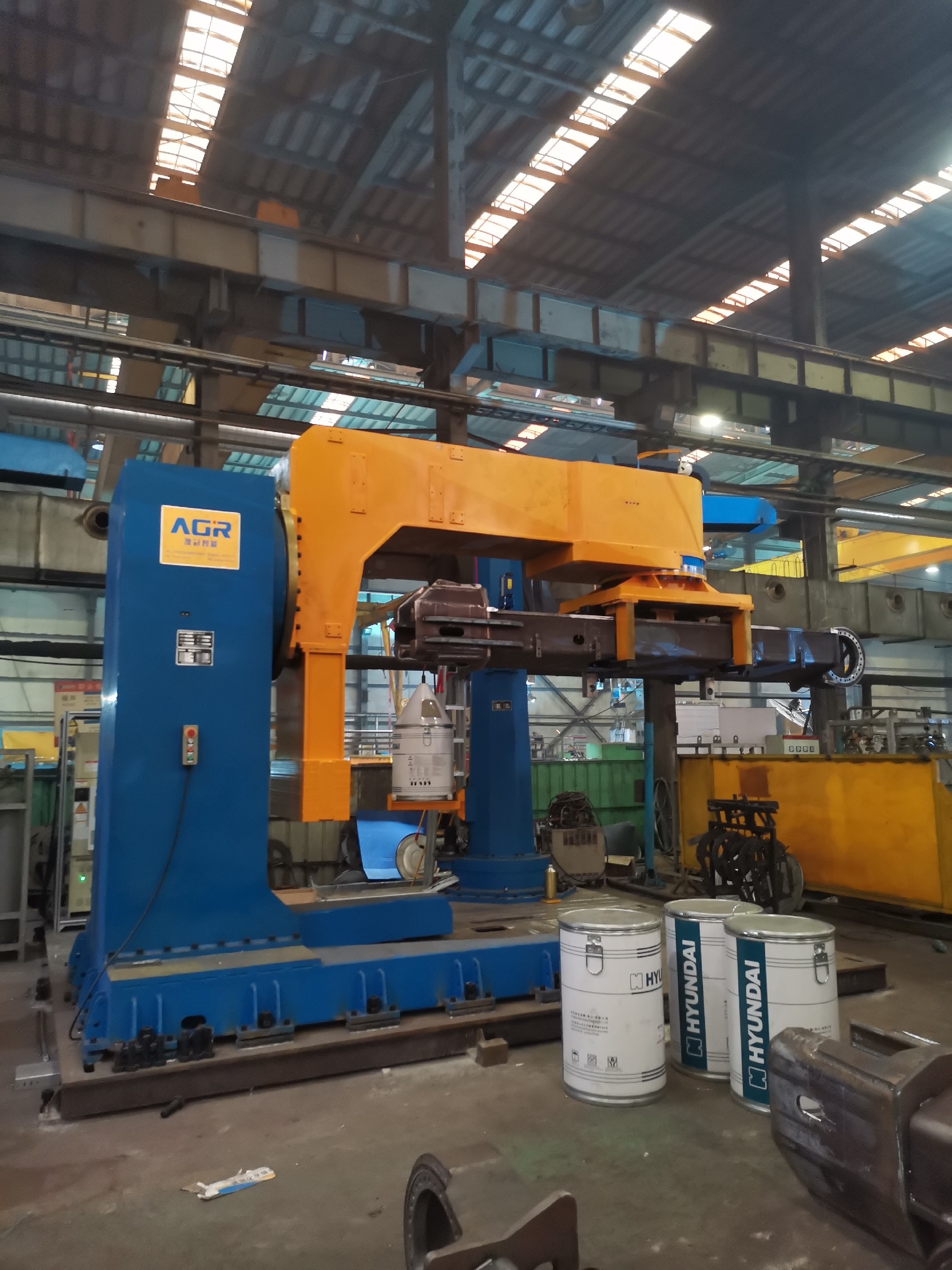 3. 單軸翻轉(zhuǎn)變位機(jī):變位機(jī)能夠在工件周圍進(jìn)行連續(xù)轉(zhuǎn)動,使得機(jī)器人能夠從不同角度接近工件,實現(xiàn)連續(xù)焊接。這種設(shè)計提高了焊接過程的連續(xù)性和一致性,從而提高了焊接質(zhì)量。變位機(jī)的可調(diào)性使得工作站能夠適應(yīng)不同長度的履帶梁焊接需求。
