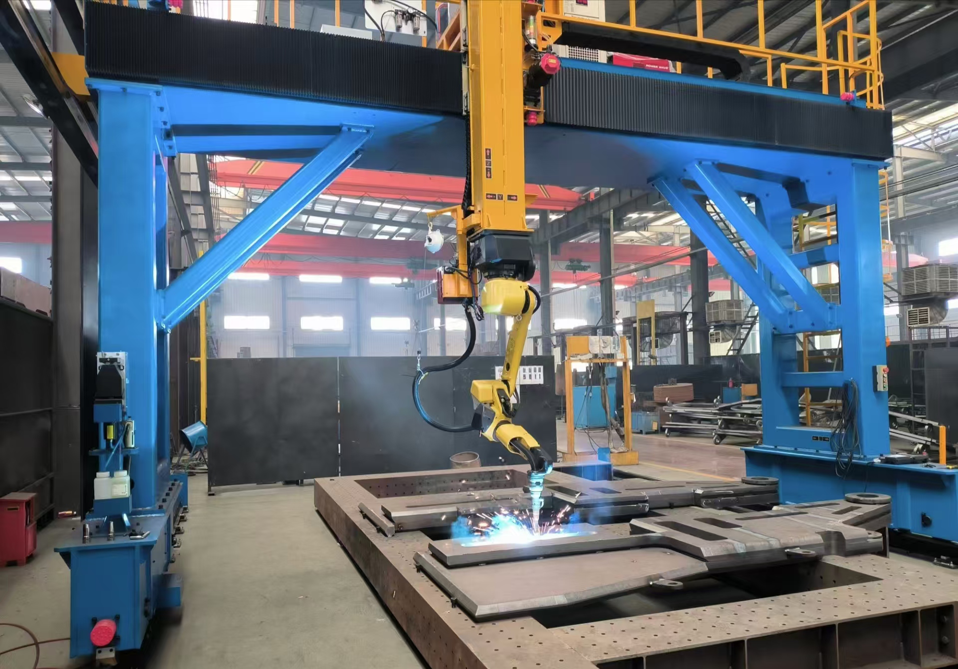通過(guò)六軸機(jī)器人、三軸龍門(mén)行走機(jī)構(gòu)以及兩軸 L 型變位機(jī)配合使用,使得該機(jī)器人工作系統(tǒng)有較大的工作范圍和良好的系統(tǒng)柔性,即使大型復(fù)雜工件上可達(dá)性不好的空間焊縫,也可輕松勝任!