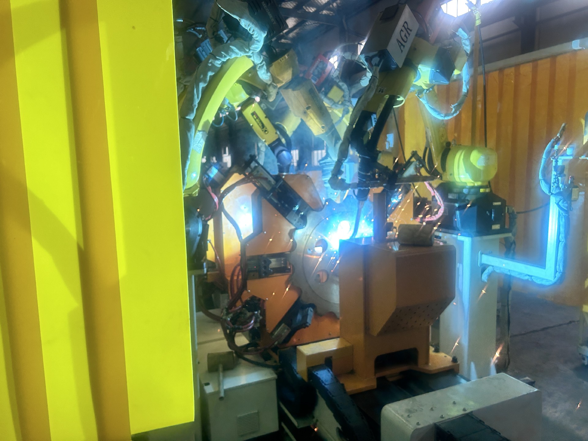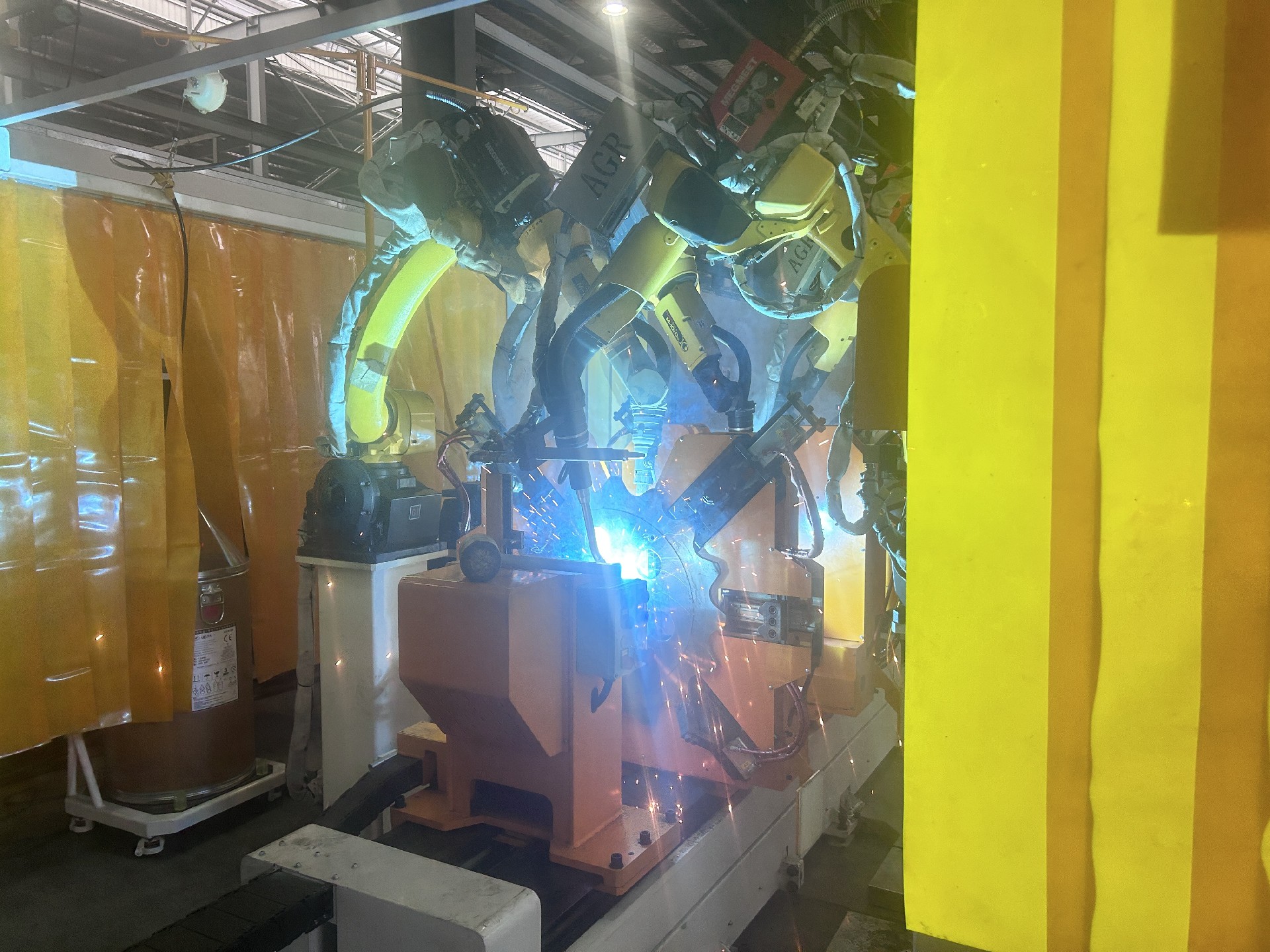 (3)焊接位配置四臺機(jī)器人,其中兩臺負(fù)責(zé)烤火預(yù)熱,全部四臺兼責(zé)點(diǎn)焊與焊接工作。