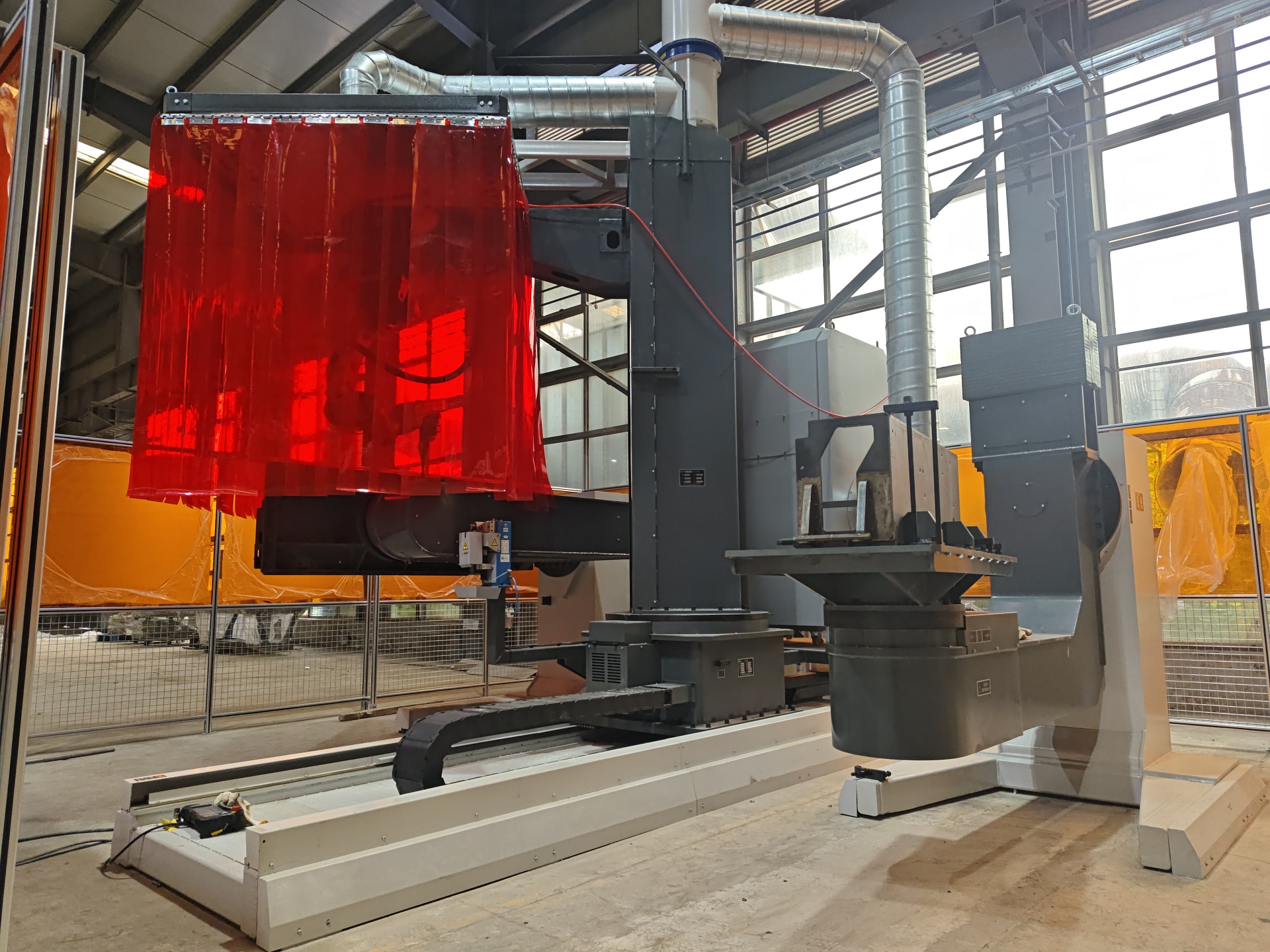 車架焊接機器人工作站主要由一臺地軌倒吊三軸行走機構(X+Z+旋轉)、一臺松下機器人、一套松下焊接設備、兩臺負載1噸L型兩軸伺服聯(lián)動變位機以及其余周邊設備構成。