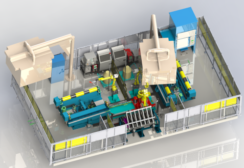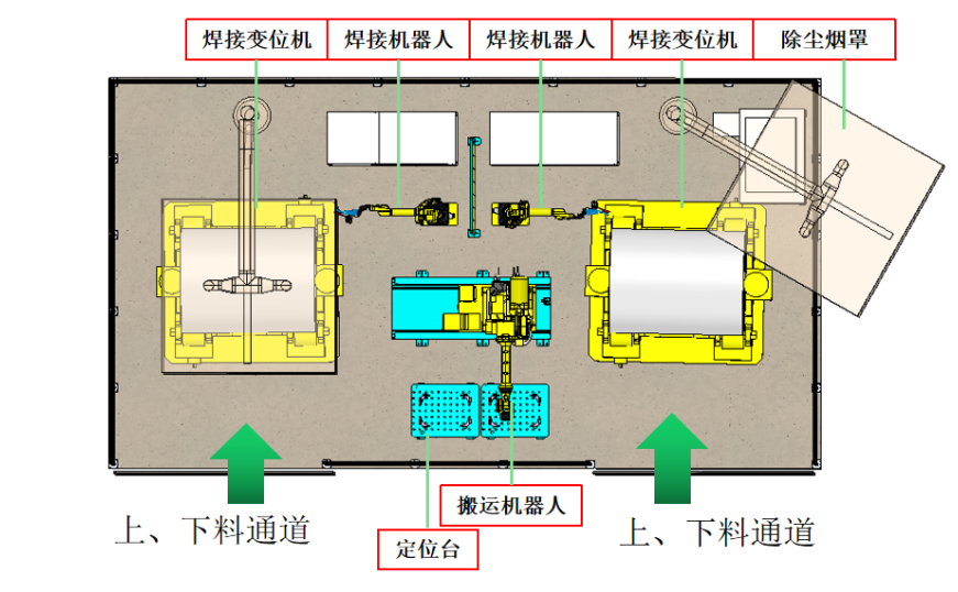 工作站包含雙工位,由兩臺焊接機器人分別對應(yīng)每個工位的焊接任務(wù)。焊接的是兩種產(chǎn)品,搬運機器人負(fù)責(zé)自動拼點任務(wù)。