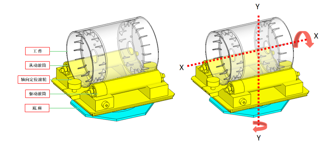 變位機包含可以使工件繞軸向中心旋轉(zhuǎn)的X軸以及繞變位機底座中心旋轉(zhuǎn)的Y軸,兩軸均為聯(lián)動伺服電機控制,其中X軸為雙驅(qū)動。X軸轉(zhuǎn)動范圍為±360°,Y軸轉(zhuǎn)動范圍為±180°。